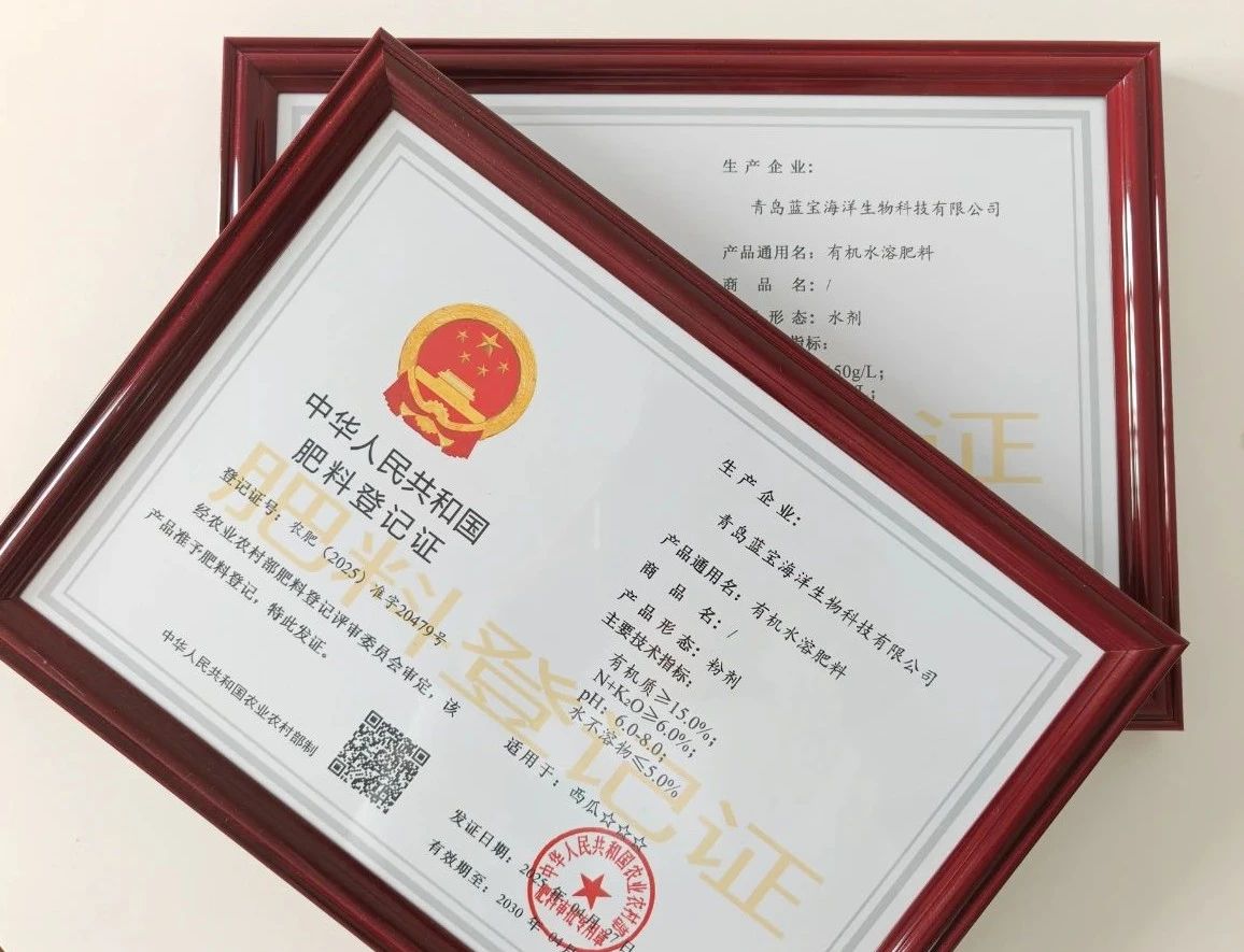 近日,我司獲得兩個(gè)有機(jī)水溶肥證號(hào),至此,我們已構(gòu)建“腐植酸+有機(jī)水溶肥”雙賽道認(rèn)證體系,覆蓋水劑、粉劑全劑型。